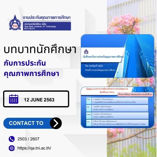 HOME อบรมการเขียนผลการดำเนินงาน (SAR) 27 มี.ค.69 TNI CORE VALUES ปรัชญาการศึกษา เอกสารอบรม 27 มี.ค.69 คู่มือเกณฑ์ AUN-QA V 4.0 ผลลัพธ์การเรียนรู้ 65 กรอบคุณวุฒิแห่งชาติ กิจกรรมแผนกประกันคุณภาพการศึกษา