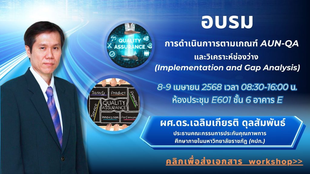 อบรมการดำเนินการตามเกณฑ์ AUN-QA March 23, 2026 Posted by QA Admin เอกสารอบรม Updated: March 30, 2026 at 9:53 am ◀ อบรมเชิงปฏิบัติการจัดทำรายงาน การประเมินตนเอง ตามเกณฑ์ AUN-QA อบรมการเขียนผลดำเนินงาน (SAR) ตามเกณฑ์ AUN-QA ▶